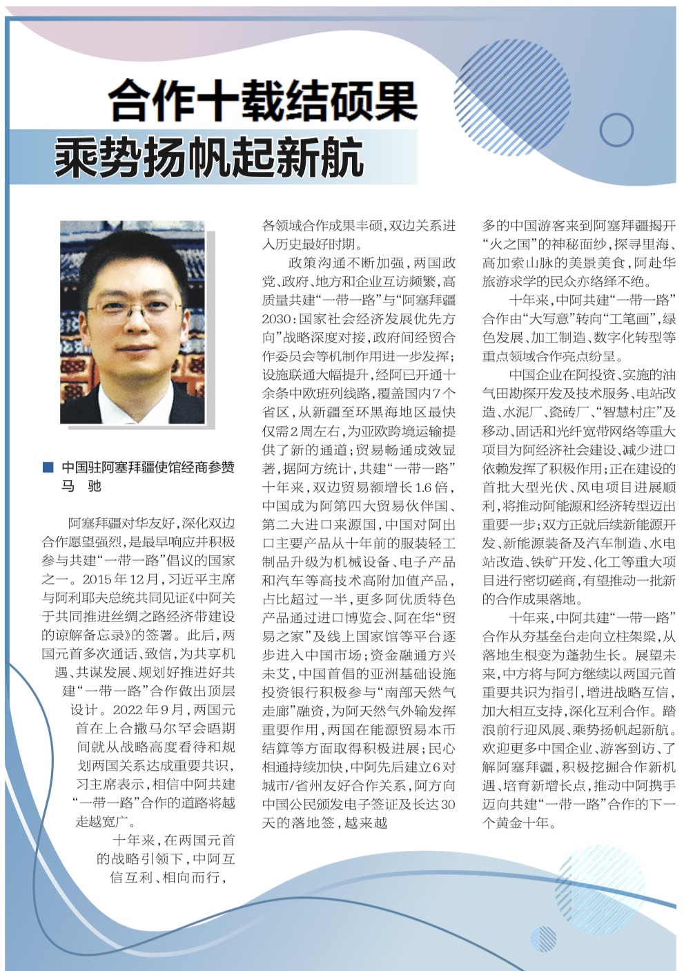 10月18日,马驰参赞在《国际商报》发表署名文章《合作十载结硕果 乘势扬帆起新航》,全文如下: